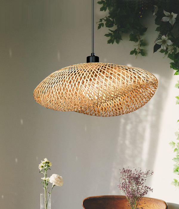 촘촘히 짜여진 라탄 소재로 만들어진 아름다운 조명